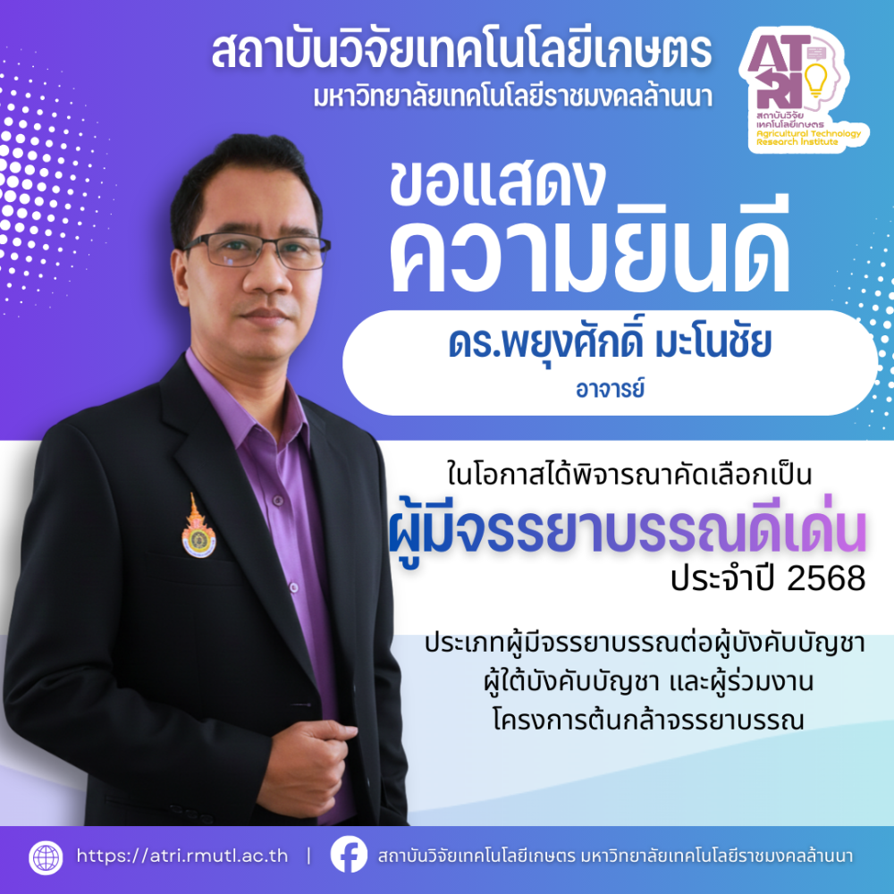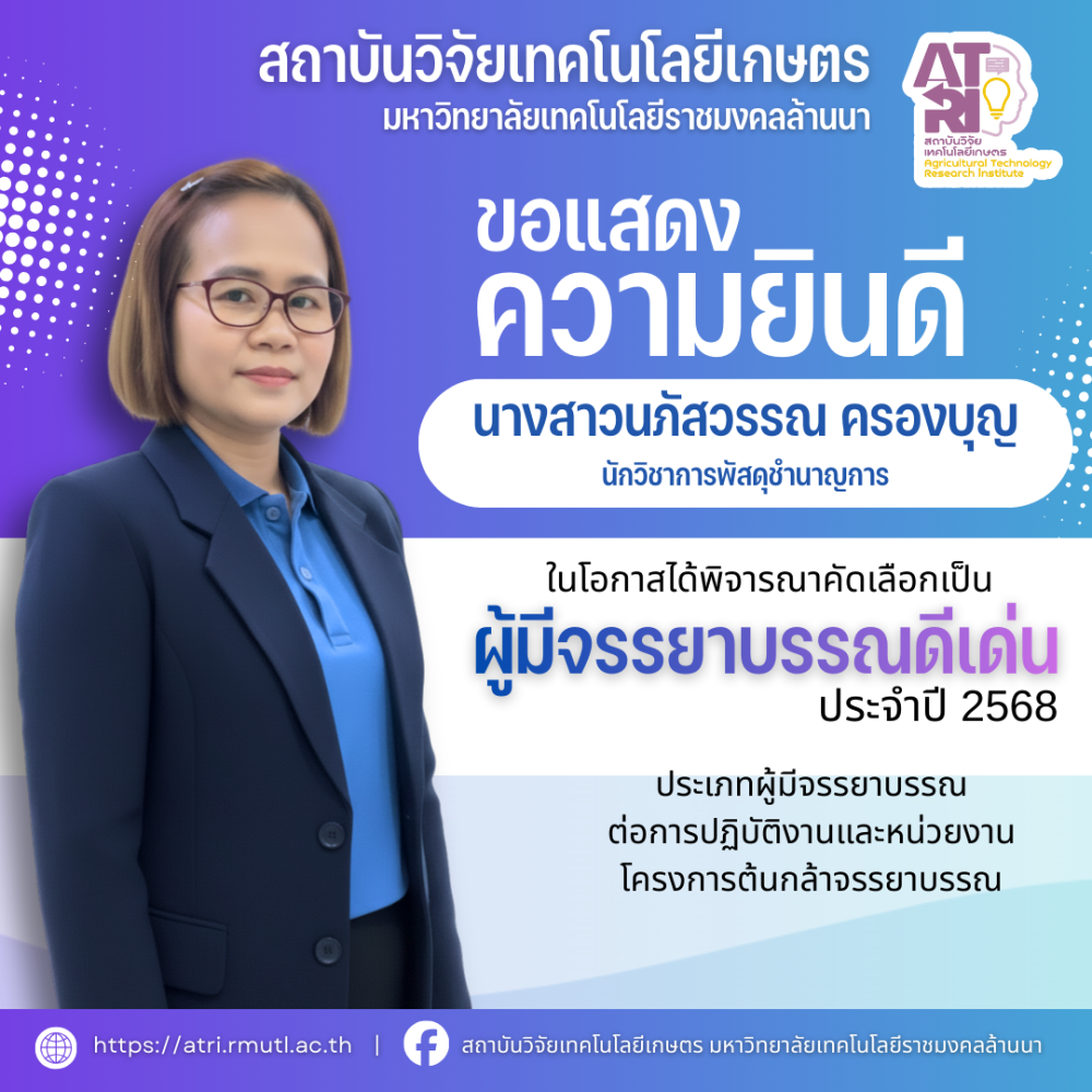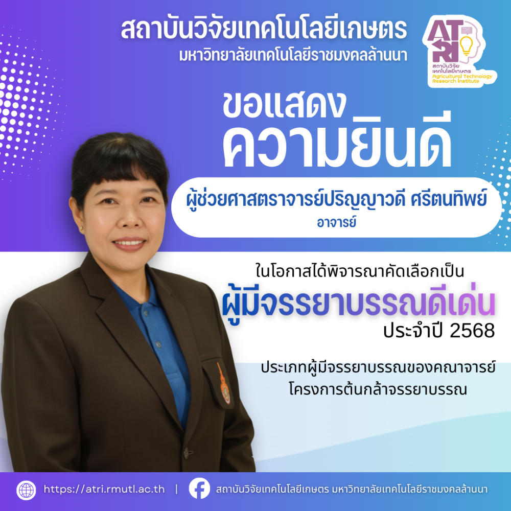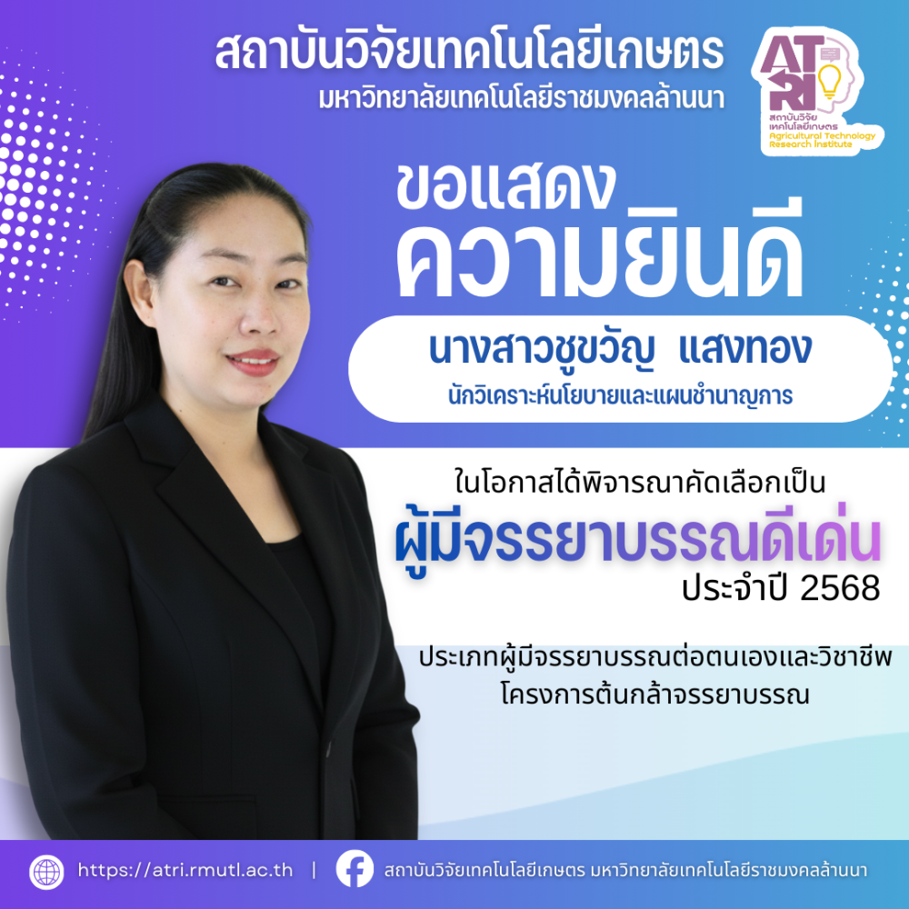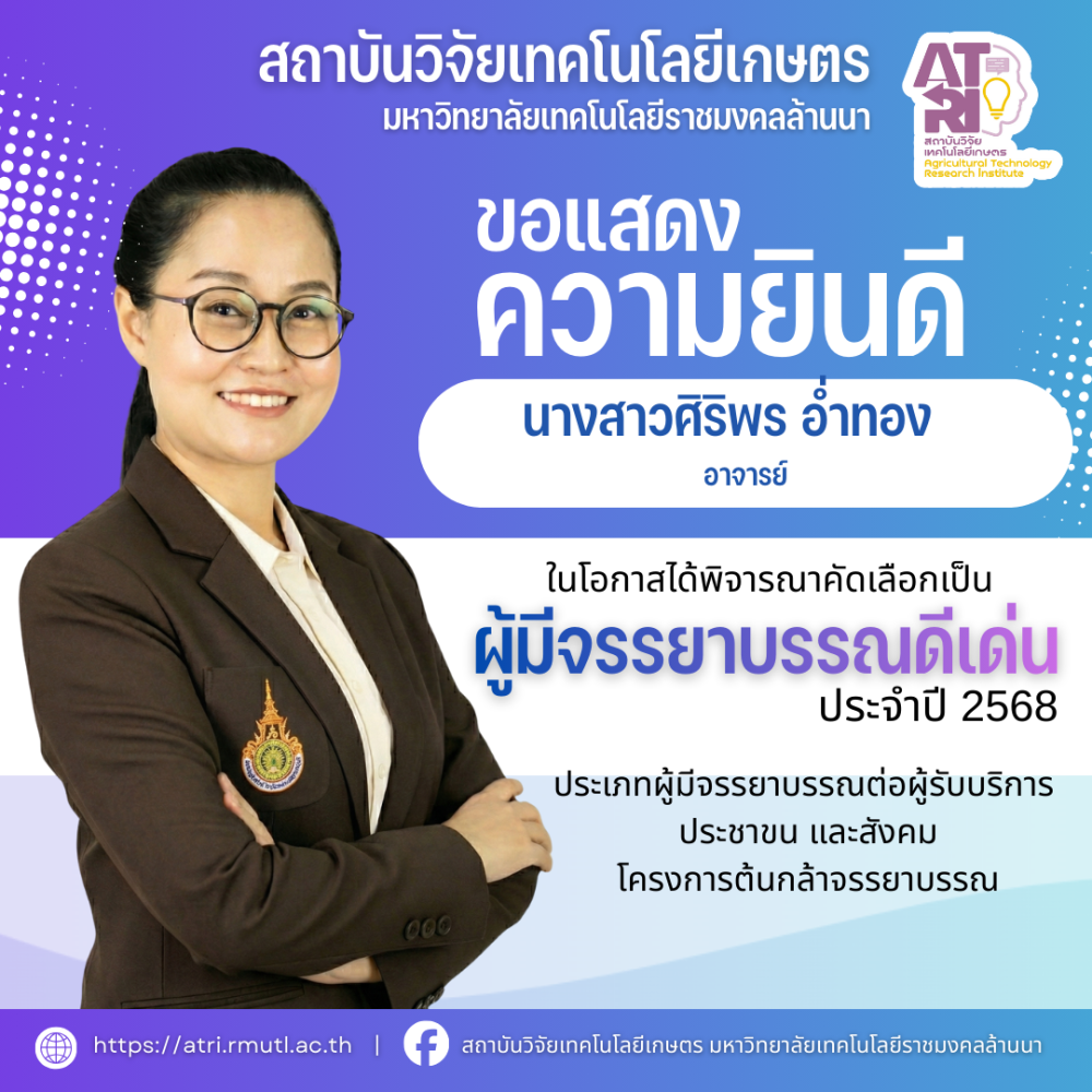 สถาบันวิจัยเทคโนโลยีเกษตร มหาวิทยาลัยเทคโนโลยีราชมงคลล้านนา ขอแสดงความยินดีกับบุคลากรในโอกาสได้รับรางวัล “ผู้มีจรรยาบรรณดีเด่น ประจำปี พ.ศ. 2568" โครงการต้นกล้าจรรยาบรรณ ตามแผนปฏิบัติการ...