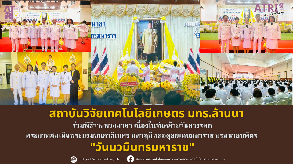 เมื่อวันที่ 13 ตุลาคม 2568 | สถาบันวิจัยเทคโนโลยีเกษตร มหาวิทยาลัยเทคโนโลยีราชมงคลล้านนา (มทร.ล้านนา) นำโดย ผู้ช่วยศาสตราจารย์สันติ ช่างเจรจา รองผู้อำนวยการฝ่ายบริหาร พร้อมด้วย รองศาสตราจารย์ ดร.ชิติ ศรีตนทิพย์ และบุคลากรของสถาบันฯ เข้าร่วมพิธีวางพวงมาลาและพิธียืนสงบนิ่ง ณ อาคารหอประชุมจังหวัดลำปาง เพื่อน้อมรำลึกในพระมหากรุณาธิคุณ เนื่องในวันคล้ายวันสวรรคต พระบาทสมเด็จพระบรมชนกาธิเบศร มหาภูมิพลอดุลยเดชมหาราช บรมนาถบพิตร "วันนวมินทรมหาราช"