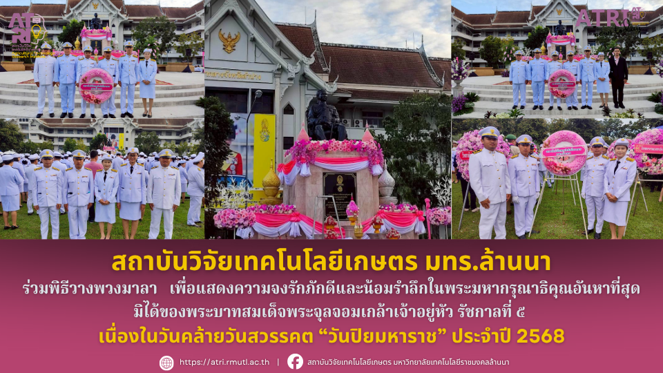 สถาบันวิจัยเทคโนโลยีเกษตร มหาวิทยาลัยเทคโนโลยีราชมงคลล้านนา นำโดย ผศ. ดร.อภิชาติ ชิดบุรี ผู้อำนวยการสถาบันฯ พร้อมด้วยคณะผู้บริหารและตัวแทนบุคลากร เข้าร่วมพิธีวางพวงมาลาเพื่อแสดงความจงรักภักดีและน้อมรำลึกในพระมหากรุณาธิคุณอันหาที่สุดมิได้ของพระบาทสมเด็จพระจุลจอมเกล้าเจ้าอยู่หัว รัชกาลที่ ๕ เนื่องในวันคล้ายวันสวรรคต “วันปิยมหาราช” ประจำปี 2568