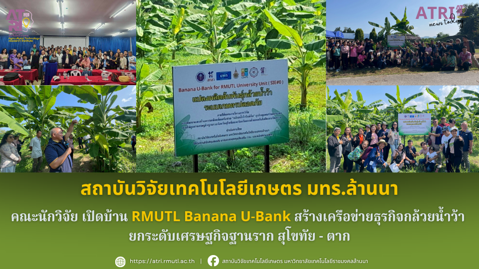 คณะนักวิจัยจากสถาบันวิจัยเทคโนโลยีเกษตร มหาวิทยาลัยเทคโนโลยีราชมงคลล้านนา (มทร.ล้านนา) นำโดย ดร.สุภาวดี แช่ม หัวหน้าชุดโครงการวิจัย “กล้วยน้ำว้ารักษ์ถิ่น” และคณะทีมงานวิจัย จัดกิจกรรม “การประชุมเครือข่ายกล้วยน้ำว้ารักษ์ถิ่น และ RMUTL Banana U-Bank Open House” ระหว่างวันที่ 21–22 ตุลาคม 2568 ณ จังหวัดลำปาง เพื่อส่งเสริมการพัฒนาเครือข่ายธุรกิจชุมชนกล้วยน้ำว้าในพื้นที่จังหวัดสุโขทัยและตาก ด้วยเทคโนโลยีและนวัตกรรม