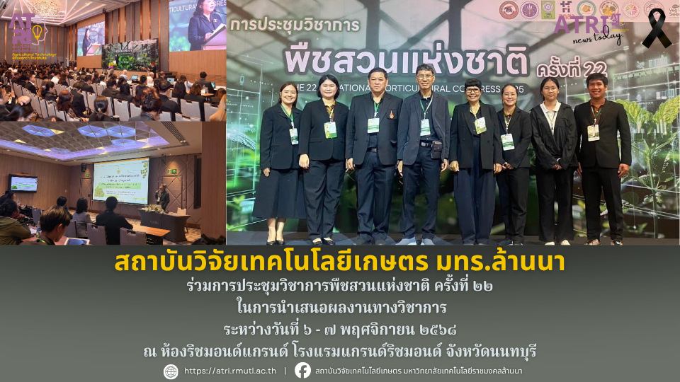 วันที่ 6–7 พฤศจิกายน 2568 สถาบันวิจัยเทคโนโลยีเกษตร มหาวิทยาลัยเทคโนโลยีราชมงคลล้านนา นำโดยผู้ช่วยศาสตราจารย์ ดร.อภิชาติ ชิดบุรี ผู้อำนวยการสถาบันฯ พร้อมด้วยรองศาสตราจารย์ ดร.ชิติ ศรีตนทิพย์ รองผู้อำนวยการฝ่ายวิจัย และคณะ ได้เข้าร่วมการประชุมวิชาการพืชสวนแห่งชาติ ครั้งที่ 22 ณ โรงแรมแกรนด์ริชมอนด์ จังหวัดนนทบุรี เพื่อร่วมเสนอผลงานวิชาการที่ผ่านการพิจารณาจากคณะกรรมการจัดงาน