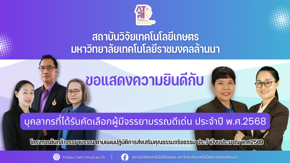 สถาบันวิจัยเทคโนโลยีเกษตร มหาวิทยาลัยเทคโนโลยีราชมงคลล้านนา ขอแสดงความยินดีกับบุคลากรในโอกาสได้รับรางวัล “ผู้มีจรรยาบรรณดีเด่น ประจำปี พ.ศ. 2568" โครงการต้นกล้าจรรยาบรรณ ตามแผนปฏิบัติการส่งเสริมคุณธรรมจริยธรรม ประจำปีงบประมาณ พ.ศ. 2569 มหาวิทยาลัยเทคโนโลยีราชมงคลล้านนา ประกาศ ณ วันที่ 28 พฤศจิกายน 2568  จำนวน 5 ประเภท ดังนี้