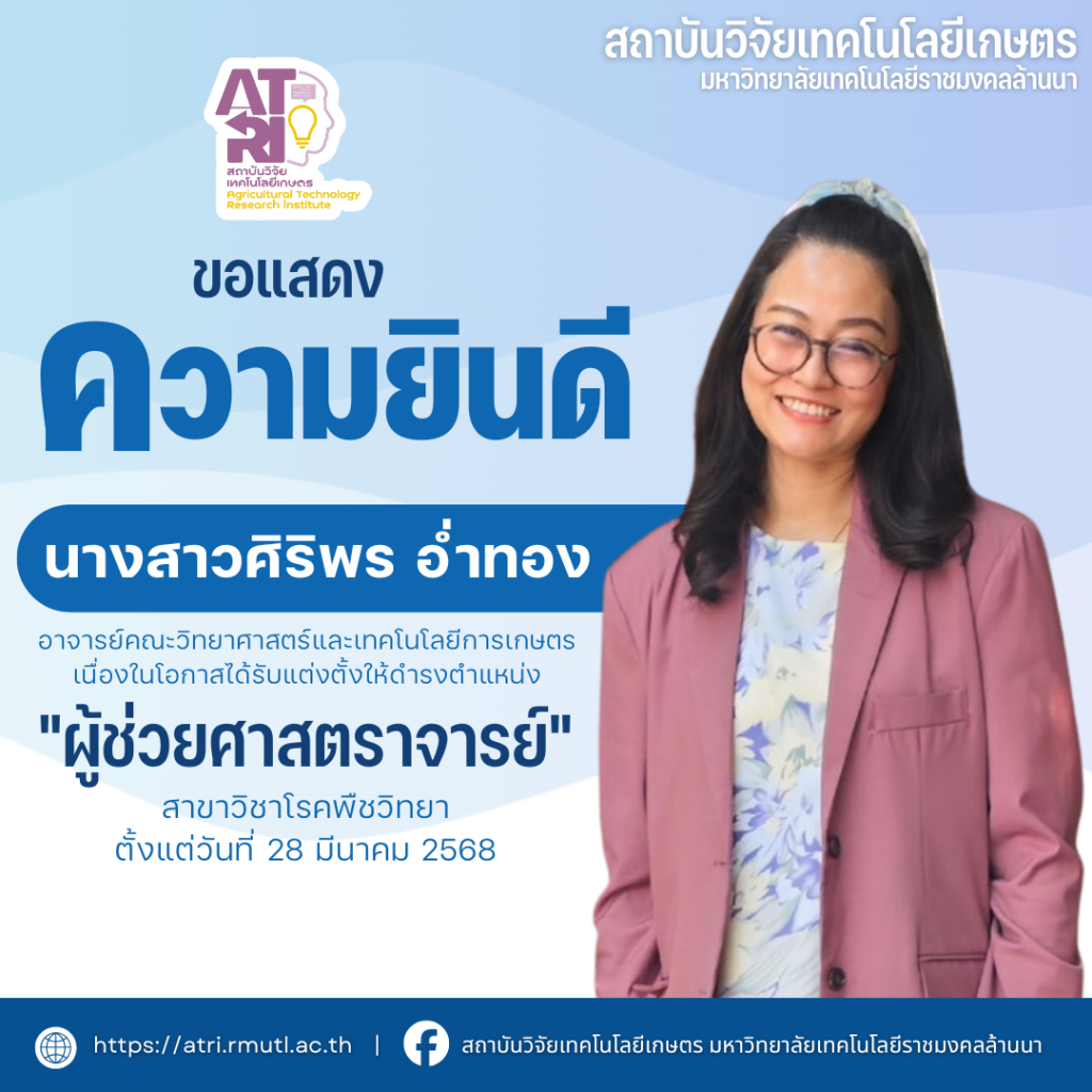 สถาบันวิจัยเทคโนโลยีเกษตร มหาวิทยาลัยเทคโนโลยีราชมงคลล้านนา ขอแสดงความยินดีกับ นางสาวศิริพร อ่ำทอง อาจารย์คณะวิทยาศาสตร์และเทคโนโลยีการเกษตรลำปาง เนื่องในโอกาสได้รับแต่งตั้งให้ดำรงตำแหน่ง "ผู้ช่วยศาสตราจารย์" สาขาวิชาโรคพืชวิทยา ตั้งแต่วันที่ 28 มีนาคม 2568
