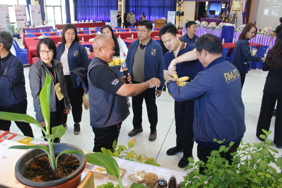 ต่อจากนั้น คณะทำงานได้เข้าชมนิทรรศการผลงานวิจัยและบริการวิชาการ ณ ห้องประชุมมะเกี๋ยง ซึ่งประกอบด้วยผลงานจาก โครงการ บพท., คลินิกเทคโนโลยี, โครงการ อพ.สธ. และหน่วยงานอื่น ๆ ที่สะท้อนศักยภาพด้านวิจัยและการพัฒนาท้องถิ่นของสถาบัน