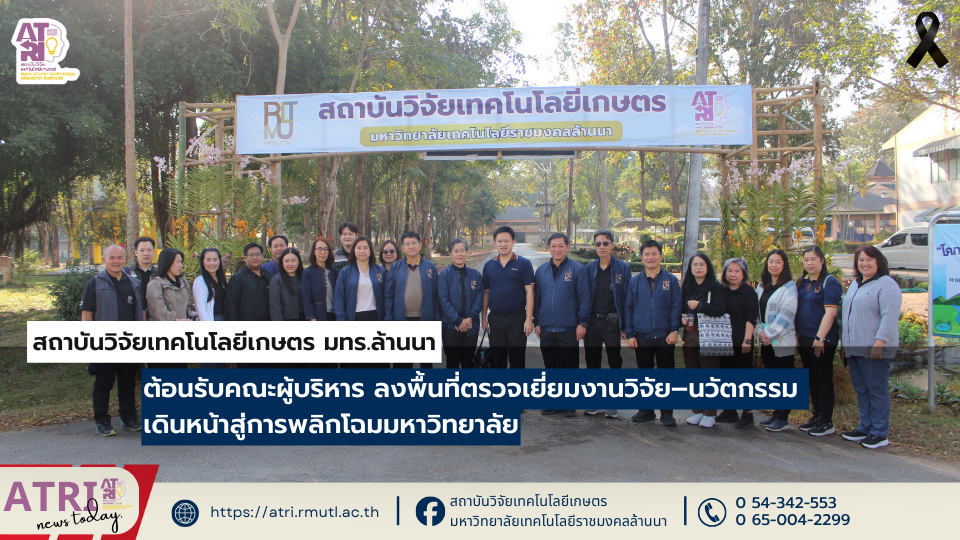 วันที่ 28 มกราคม 2569 สถาบันวิจัยเทคโนโลยีเกษตร มหาวิทยาลัยเทคโนโลยีราชมงคลล้านนา ให้การต้อนรับคณะผู้บริหารมหาวิทยาลัย ในการลงพื้นที่ตรวจเยี่ยมหน่วยปฏิบัติการด้านวิจัย นวัตกรรม และโครงสร้างพื้นฐาน รวมถึงเข้าร่วมประชุมหารือเพื่อพัฒนาทิศทางการขับเคลื่อนมหาวิทยาลัยสู่การ “พลิกโฉม” ในอนาคต