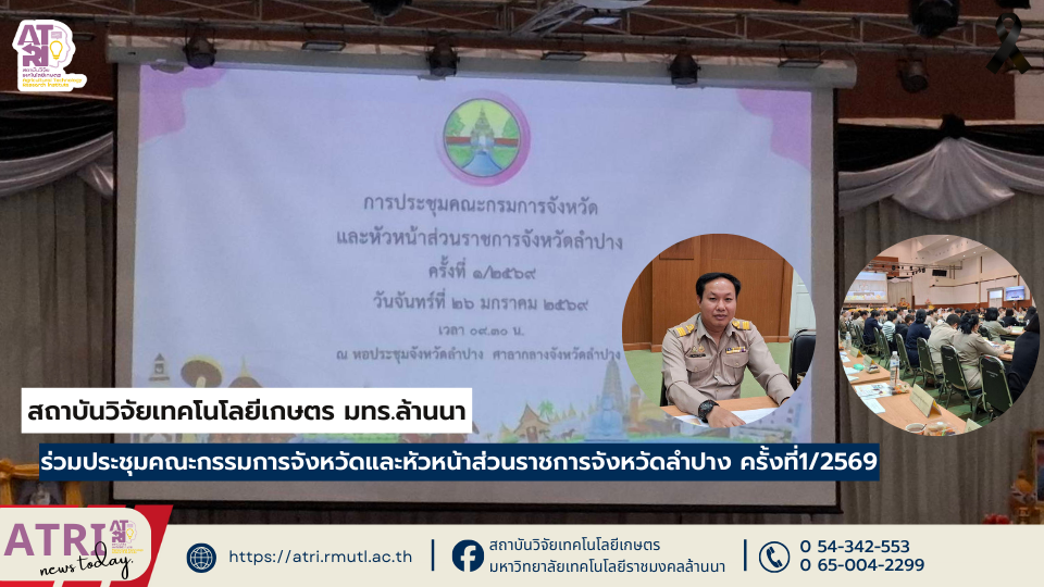 วันที่ 26 มกราคม 2569 (ช่วงเช้า) นายอำนาจ อุ้ยฟูใจ ผู้ช่วยผู้อำนวยการฝ่ายบริหาร ตัวแทนผู้อำนวยการ สถาบันวิจัยเทคโนโลยีเกษตร มทร.ล้านนา ร่วมประชุมคณะกรรมการจังหวัดและหัวหน้าส่วนราชการจังหวัดลำปาง ครั้งที่1/2569 ณ หอประชุมจังหวัดลำปาง ศาลากลางจังหวัดลำปาง