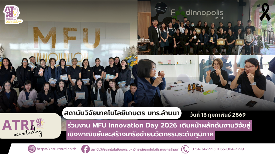 วันที่ 16 กุมภาพันธ์ นางอำไพ แสนคำ ผู้ช่วยผู้อำนวยการฝ่ายวิจัย และนางสาวปัทมา ไทยอู่ เข้าร่วมงาน "MFU Innovation Day 2026" ซึ่งจัดโดย มหาวิทยาลัยแม่ฟ้าหลวง ส่วนจัดการทรัพย์สินทางปัญญาและนวัตกรรม จัดขึ้นระหว่างวันที่ 16-17 กุมภาพันธ์ 2569 ณ กลุ่มอาคาร M-Square เพื่อเปิดพื้นที่แสดงศักยภาพด้านงานวิจัย เทคโนโลยี และนวัตกรรม พร้อมผลักดันการต่อยอดสู่การใช้ประโยชน์เชิงพาณิชย์ และสร้างเครือข่ายความร่วมมือระหว่างมหาวิทยาลัย ภาคเอกชน และผู้ประกอบการในระดับภูมิภาคและประเทศ