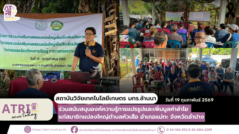 วันพุธที่ 19 กุมภาพันธ์ 2569 สำนักงานเกษตรอำเภอแม่ทะ จัดกิจกรรมเวทีการเรียนรู้ภายใต้โครงการระบบส่งเสริมเกษตรแบบแปลงใหญ่ (แปลงปีที่ 2) ณ ศาลาอเนกประสงค์ หมู่ 11 ตำบลหัวเสือ อำเภอแม่ทะ จังหวัดลำปาง โดยมีสมาชิกแปลงใหญ่ลำไยตำบลหัวเสือเข้าร่วม เพื่อเพิ่มพูนทักษะด้านการผลิตและการพัฒนาผลิตภัณฑ์ตามความต้องการของกลุ่มเกษตรกร