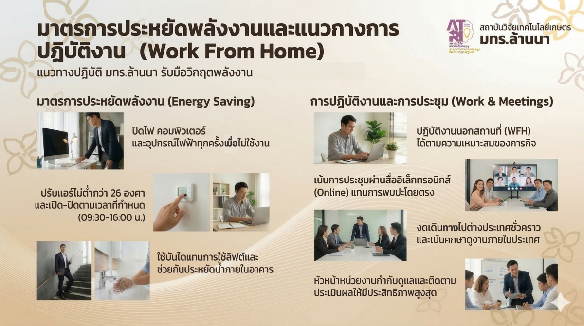 สถาบันวิจัยเทคโนโลยีเกษตร มทร.ล้านนา แจ้ง มาตรการประหยัดพลังงานและแนวทางการปฏิบัติงาน (Work From Home) เพื่อร่วมรับมือวิกฤตพลังงาน ⚡