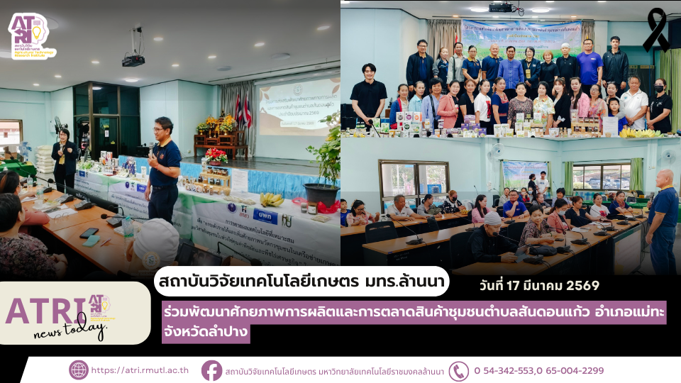 เมื่อวันอังคารที่ 17 มีนาคม 2569 สถาบันวิจัยเทคโนโลยีเกษตร มหาวิทยาลัยเทคโนโลยีราชมงคลล้านนา ได้เข้าร่วมจัดกิจกรรม โครงการส่งเสริมพัฒนาศักยภาพทางการผลิตและการตลาดสินค้าชุมชนตำบลสันดอนแก้ว ประจำปีงบประมาณ 2569 ณ อาคารอเนกประสงค์เทศบาลตำบลสิริราช หมู่ที่ 3 ตำบลสันดอนแก้ว อำเภอแม่ทะ จังหวัดลำปาง โดยมีผู้แทนกลุ่มอาชีพในพื้นที่ หน่วยงานท้องถิ่น และเครือข่ายที่เกี่ยวข้องเข้าร่วม